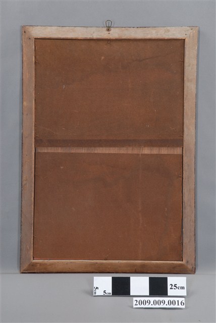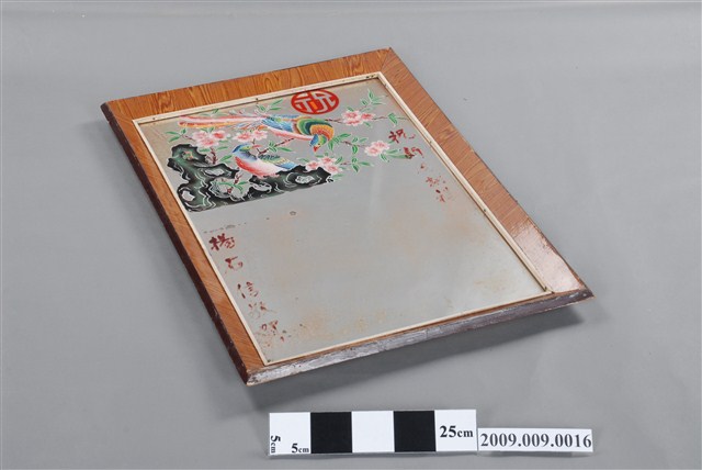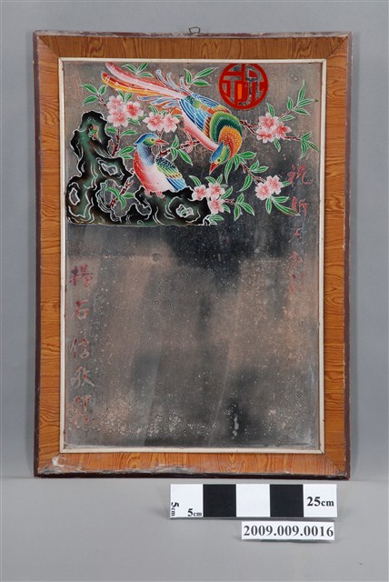 1.本件為直立長方形,有邊框,上以花鳥構圖,下則留白供寫祝賀文字。本件上款寫「祝新居誌禧」,下款為楊石信敬賀。2.玻璃畫是將畫稿人之底稿置於玻璃下,畫師在玻璃上描好圖案後,在玻璃後進行反畫。