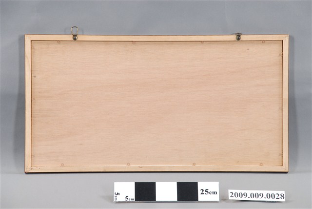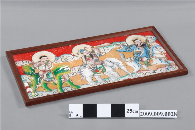 本件為八仙玻璃畫神明彩,彩繪八仙其中的曹國舅(騎象)、呂洞賓(騎馬)、韓湘子(騎麒麟)。畫像裱框,有褪色。畫中寓意借助眾仙的神通和法寶驅邪祈福之意義。玻璃畫是將畫稿人之底稿置於玻璃下,畫師在玻璃上描好圖案後,在玻璃後進行反畫。