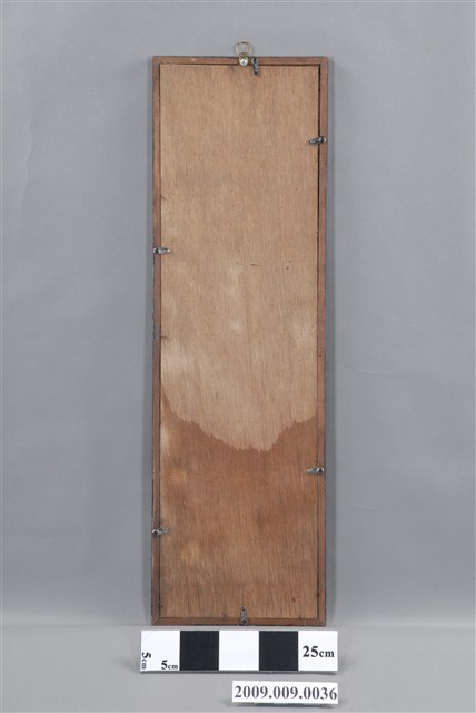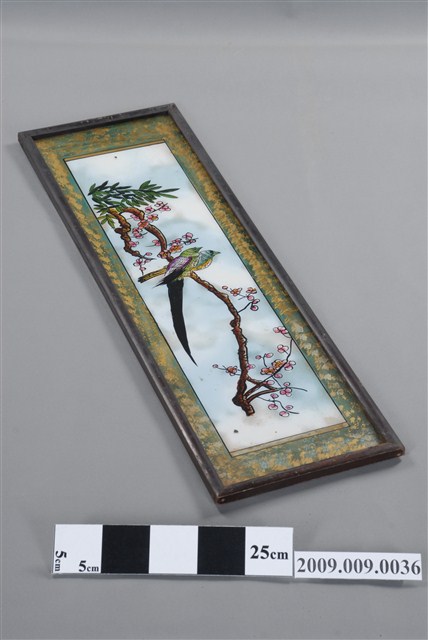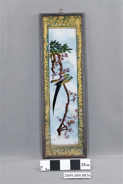 1.本件玻璃畫係以黑色畫框與玻璃畫組合而成,豎幅形式,畫中有兩隻喜鵲互相依偎一同棲於梅花折枝花卉上。民間將喜鵲作為一種報喜的吉祥鳥,「梅」與「眉」同音,故喜鵲立於梅梢寓意為「喜上眉梢」。喜鵲入畫,兩隻喜鵲站在梅花枝頭,取其吉祥寓意,形容雙喜臨門,幸運吉祥。2.玻璃畫是以顏料在玻璃的背面作晝,畫法可採國畫、油畫、水粉畫等多種繪畫技法,表現山川風光、民俗故事、佛名聖事、名勝古跡、鳥獸魚蟲、奇花異草等內容,1950及60年代在臺灣常用來祝賀婚慶、入厝、祝壽及開幕誌喜等。