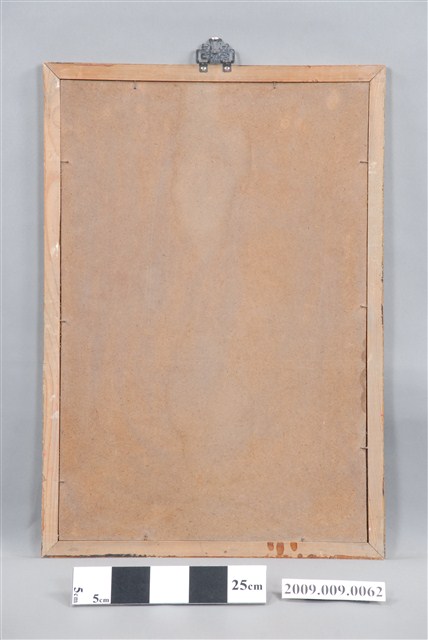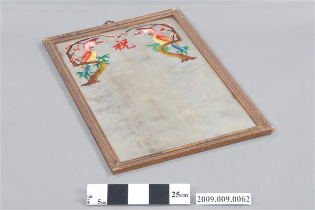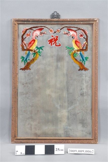 1.本件為直條,上方以冠鳥立於枝頭,中間寫一祝字。此畫寓有飛上枝頭作鳳凰之意。下方留白處的題字落款已剝落。2.玻璃畫是將畫稿人之底稿置於玻璃下,畫師在玻璃上描好圖案後,在玻璃後進行反畫。