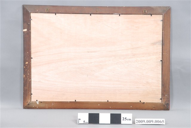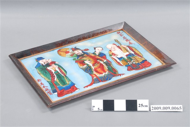 1.本件的構圖為傳統財子壽三仙圖。上款寫:祝新居誌慶,下款寫:鄭萬水敬賀。2.玻璃畫是將畫稿人之底稿置於玻璃下,畫師在玻璃上描好圖案後,在玻璃後進行反畫。