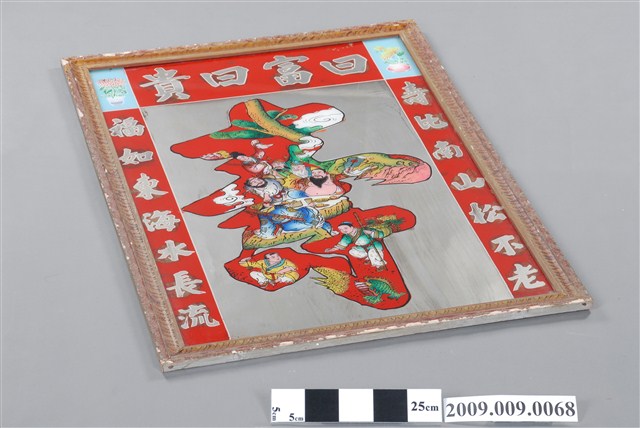1.本件中間寫一大壽字,在筆畫內則畫以八仙,有八仙祝壽之寓意。上聯寫:壽比南山松不老,下聯為:福如東海水長流,橫批:曰富曰貴。2.玻璃畫是將畫稿人之底稿置於玻璃下,畫師在玻璃上描好圖案後,在玻璃後進行反畫。