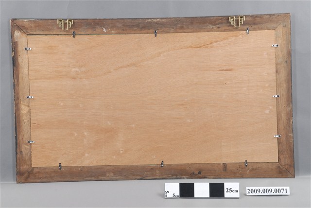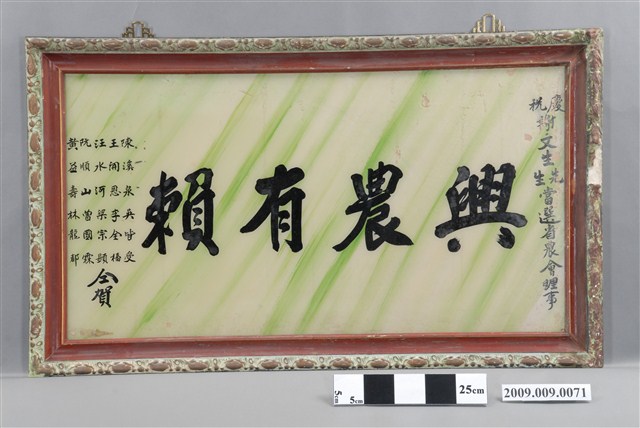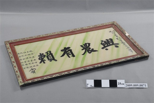 1.本件為興農有賴匾額,以玻璃畫的方式製作,上款為:慶祝謝文生先生當選省農會理事,下款為:陳溪泉、吳皆受、王開恩、李全福、汪水河、梁宗顯、阮順山、曾國霖、黃益壽、林龍都仝賀。2.玻璃畫是將畫稿人之底稿置於玻璃下,畫師在玻璃上描好圖案後,在玻璃後進行反畫。