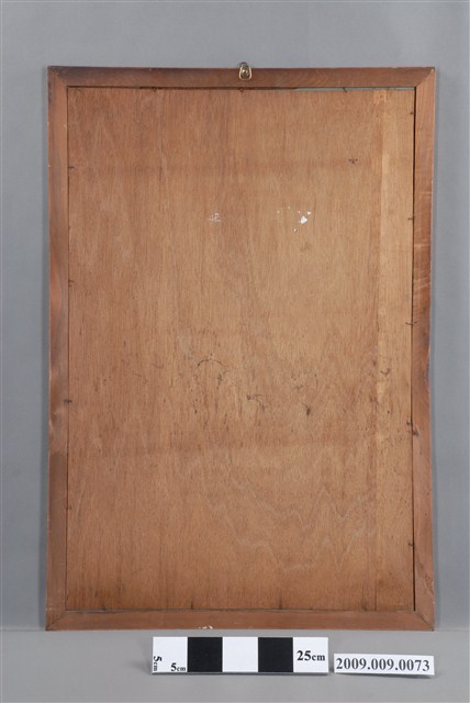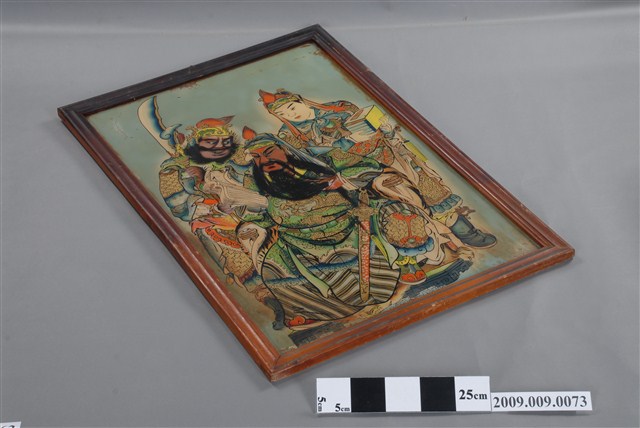 本件為關聖帝君玻璃畫神明彩,關公坐姿閱讀《春秋》,關平、周倉隨伺在後。畫像裱框。關聖帝君為佛教、道教、儒教尊奉的神明,是華人世界相當普遍的神祇,亦是臺灣漢人神明廳常見的神明圖像。玻璃畫是將畫稿人之底稿置於玻璃下,畫師在玻璃上描好圖案後,在玻璃後進行反畫。