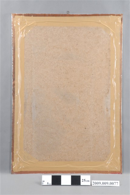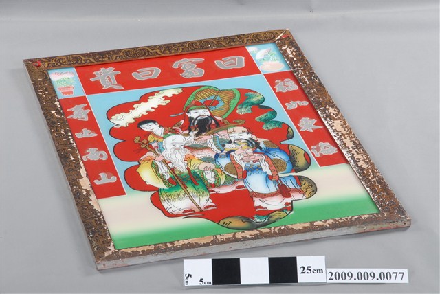 1.本件的構圖為傳統財子壽三仙圖,後方並有一侍女持扇。上聯寫:福如東海,下聯為:壽比南山,橫批:曰富曰貴。2.玻璃畫是將畫稿人之底稿置於玻璃下,畫師在玻璃上描好圖案後,在玻璃後進行反畫。