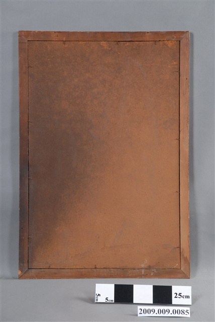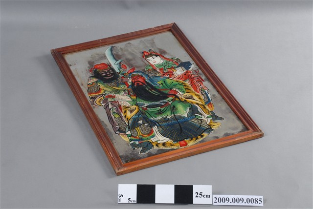 本件為關聖帝君玻璃畫神明彩,關公坐姿閱讀《春秋》,關平、周倉隨伺在後。畫像裱框。關聖帝君為佛教、道教、儒教尊奉的神明,是華人世界相當普遍的神祇,亦是臺灣漢人神明廳常見的神明圖像。玻璃畫是將畫稿人之底稿置於玻璃下,畫師在玻璃上描好圖案後,在玻璃後進行反畫。