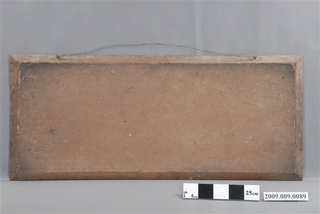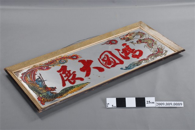1.本件為橫幅,中間寫鴻圖大展四字,兩側以龍、鳳圖像為裝飾,木質粗邊框。2.玻璃畫是將畫稿人之底稿置於玻璃下,畫師在玻璃上描好圖案後,在玻璃後進行反畫。