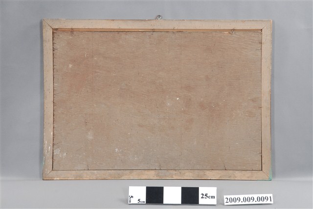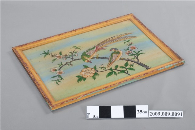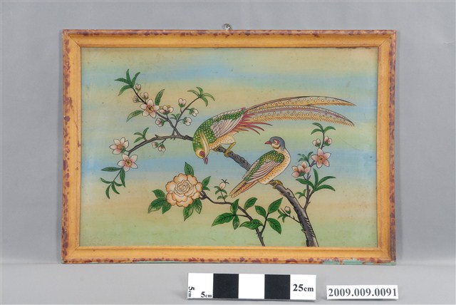 1.本件玻璃畫係以木質畫框與玻璃畫組合而成,畫作描繪一對喜鵲棲息於梅花樹枝之上。民間將喜鵲作為一種報喜的吉祥鳥,「梅」與「眉」同音,故喜鵲立於梅梢寓意為「喜上眉梢」。喜鵲入畫,兩隻喜鵲站在梅花枝頭,取其吉祥寓意,形容雙喜臨門,幸運吉祥。2.玻璃畫是以顏料在玻璃的背面作晝,畫法可採國畫、油畫、水粉畫等多種繪畫技法,表現山川風光、民俗故事、佛名聖事、名勝古跡、鳥獸魚蟲、奇花異草等內容,1950及60年代在臺灣常用來祝賀婚慶、入厝、祝壽及開幕誌喜等。
