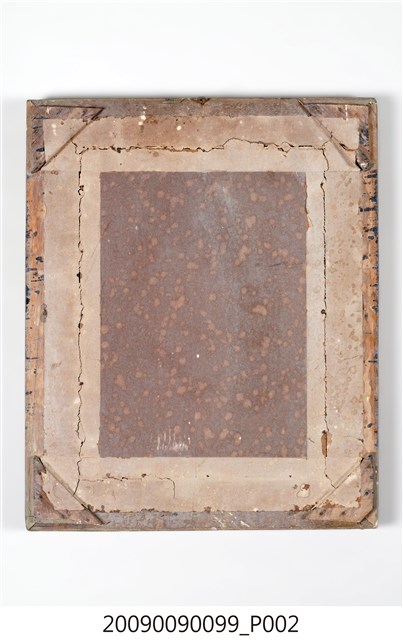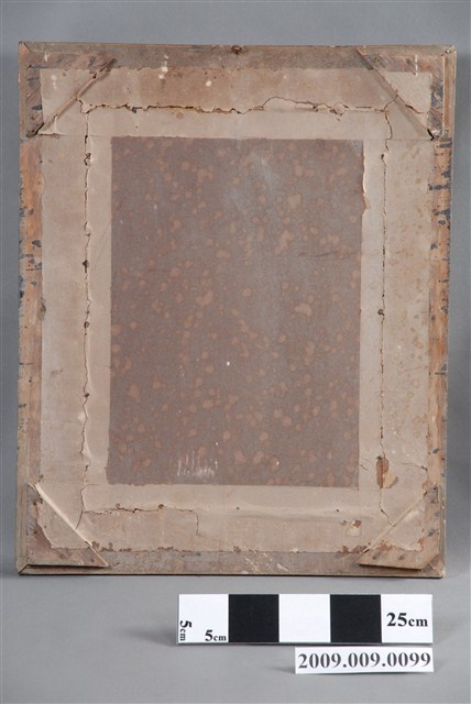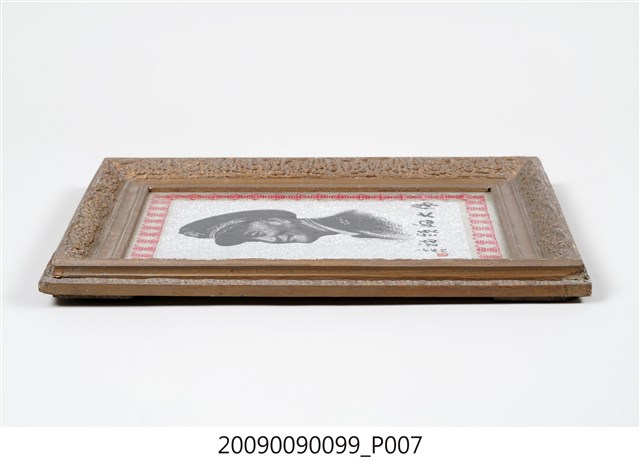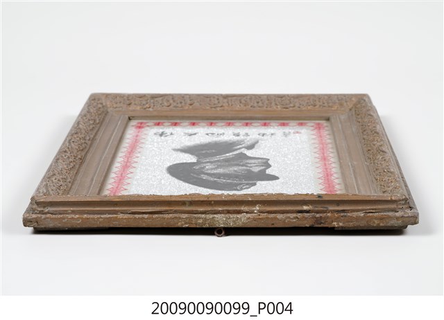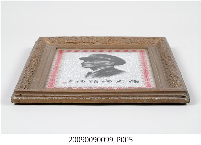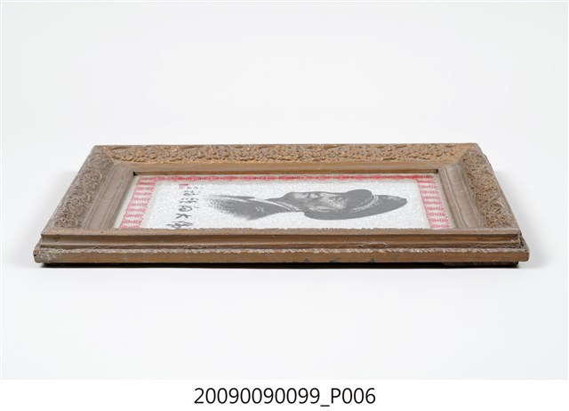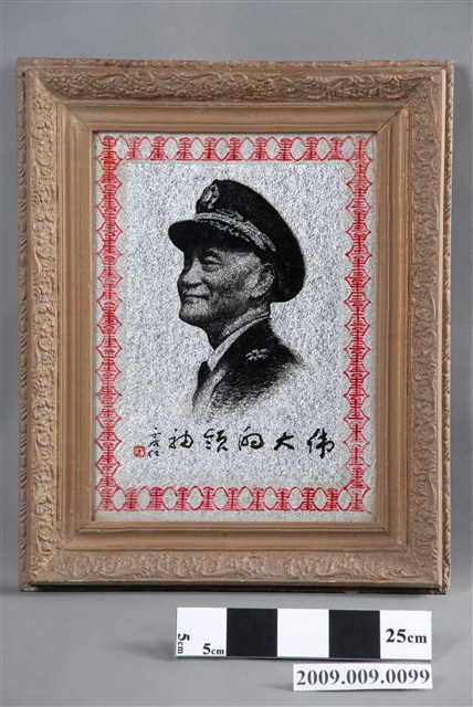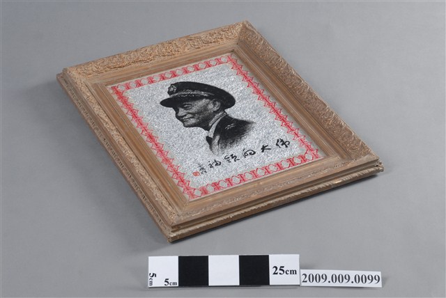 1.本件為「偉大領袖」蔣中正玻璃畫,木方框有褐色花草紋浮雕裝飾,框中裝有玻璃畫一幅,內為玻璃底板,畫中外繞一周紅色壽字,中央描繪黑色人物胸像,下為行書的「偉大的領袖」四字,左側有于右任之題記與印章。肖像的人物為頭戴國徽軍帽,身穿軍服的蔣中正胸像,人物面帶微笑,軍服有五星肩章,筆觸有素描之感,給人質樸又細膩的視覺效果,背面為木框與裱紙原色。