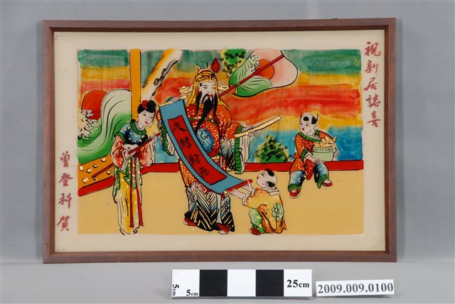 1.本件為天官賜財,以天官持卷軸,由童子托住,上寫天賜財原,背後有侍女持扇,另有一童子手抱一桶黃金。上款:祝新居誌喜,下款:曾登科賀。2.玻璃畫是將畫稿人之底稿置於玻璃下,畫師在玻璃上描好圖案後,在玻璃後進行反畫。