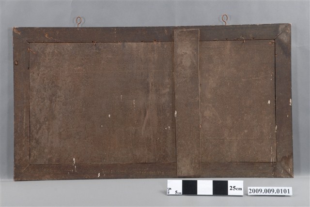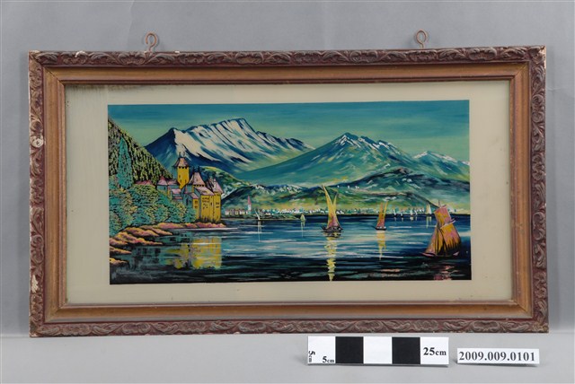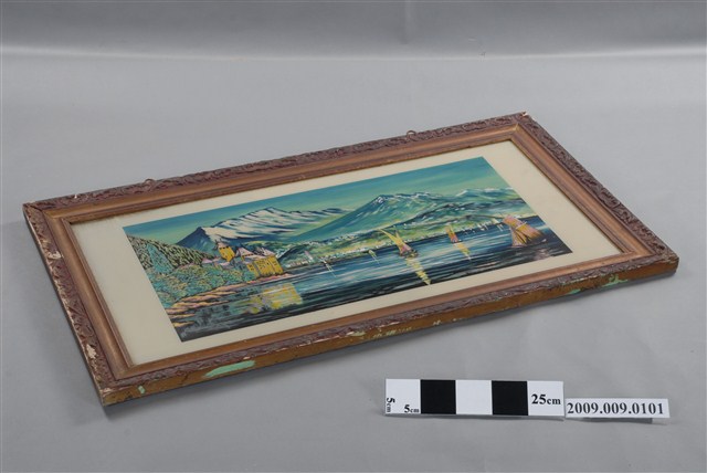 1.本件玻璃畫係以木質畫框與玻璃畫組合而成,畫作背景為數座高山,左邊沿著海岸有房屋及樹林,數條帆船航行於山海之間,水面上還有船隻的倒影,呈現悠閒寧靜的氛圍。2.玻璃畫是以顏料在玻璃的背面作晝,畫法可採國畫、油畫、水粉畫等多種繪畫技法,表現山川風光、民俗故事、佛名聖事、名勝古跡、鳥獸魚蟲、奇花異草等內容,1950及60年代在臺灣常用來祝賀婚慶、入厝、祝壽及開幕誌喜等。