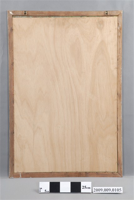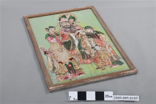 本件為福祿壽玻璃畫神明彩,以福祿壽三位仙人為主體,福代表五福臨門,祿象徵高官厚祿與子嗣,壽則是長命百歲,福仙後方有一宮娥持扇,祿仙前方有兩位童子。畫像褪色嚴重,畫作裱框。福祿壽為臺灣漢人傳統民宅神明廳常見的神明圖像。玻璃畫是將畫稿人之底稿置於玻璃下,畫師在玻璃上描好圖案後,在玻璃後進行反畫。