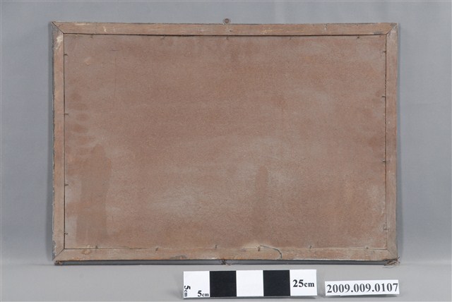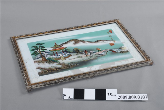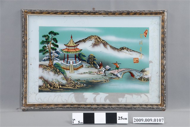 1.本件以騎馬主僕與溪邊尖頂涼亭為主體,背景為遠山。左上題有碧溪青峰等字,上有臺灣島圖記內寫赤崁,下有麗生畫室印。2.玻璃畫是將畫稿人之底稿置於玻璃下,畫師在玻璃上描好圖案後,在玻璃後進行反畫。