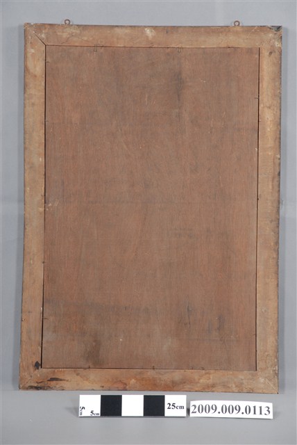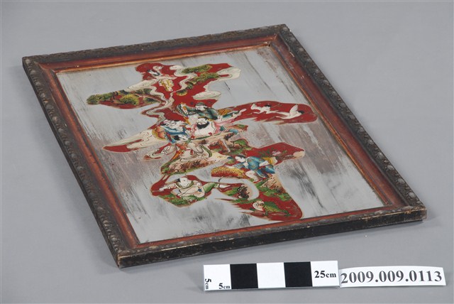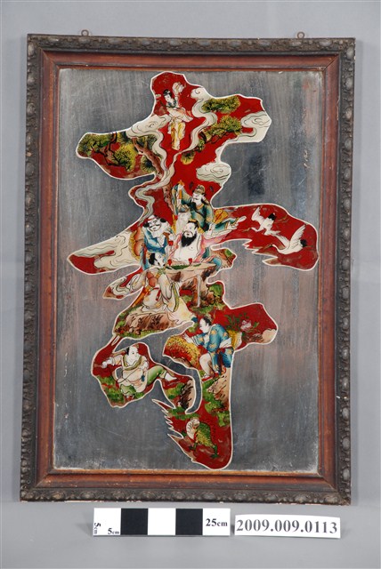 本件為壽字八仙玻璃畫神明彩,以壽字的筆畫面積,從上而下呈現八仙,分別是何仙姑、曹國舅、張果老、李鐵拐、漢鍾離(袒胸者)、呂洞賓、藍采和、韓湘子。畫作裱框。以壽字表現八仙,祝壽之意義濃厚。玻璃畫是將畫稿人之底稿置於玻璃下,畫師在玻璃上描好圖案後,在玻璃後進行反畫。