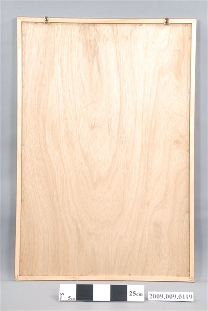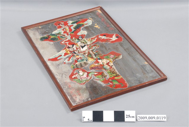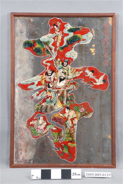 1.本圖以一大壽字為構圖,壽字中劃上八仙,做為八仙祝壽之寓意。上款:慶祝壽辰華恂,下款:□女□ □春花、黃毓棠 □。2.玻璃畫是將畫稿人之底稿置於玻璃下,畫師在玻璃上描好圖案後,在玻璃後進行反畫。