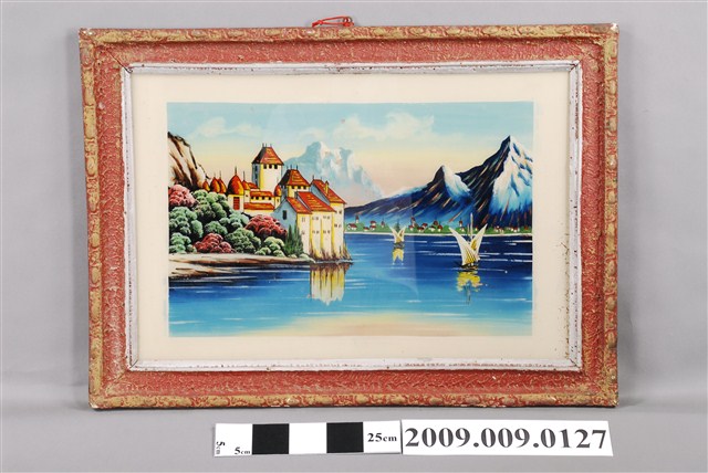 1.本件構圖為乃以海邊紅色尖頂洋房為主體,配合海上兩艘帆船,遠方則以山景為配角。2.玻璃畫是將畫稿人之底稿置於玻璃下,畫師在玻璃上描好圖案後,在玻璃後進行反畫。
