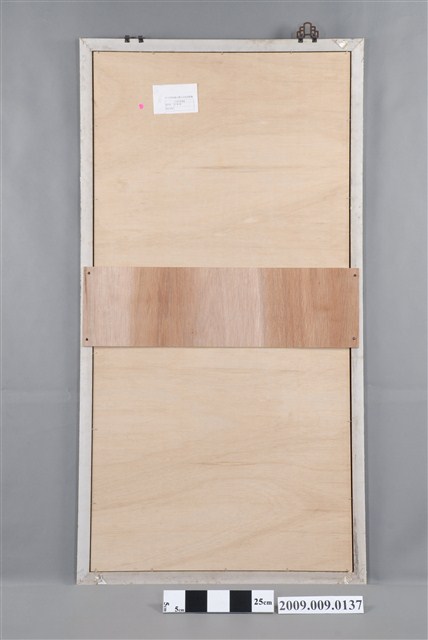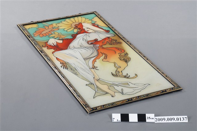 1.本件玻璃畫係以銀色金屬螺鈿鑲嵌畫框與玻璃畫組合而成,畫作迎合民眾對西洋繪畫的喜愛,仿照新藝術派知名作品幕夏的四季畫作,畫出四幅唯美女性,代表春夏秋冬四季,本畫作描繪一穿著希臘式白袍白衣,姿態慵懶的紅髮美女,上方以小雛菊作為背景來代表夏季。2.本件玻璃畫主要以歐式彩繪『玻璃-上彩』法製畫,首先使用勾邊膠筆勾勒愛圖案框架,再以刮刀沾「水晶玻璃膠」填色,並營造表面立體不規則的效果。3.玻璃畫之畫法可採國畫、油畫、水粉畫等多種繪畫技法,表現題材多樣,1950及60年代在臺灣常用來祝賀婚慶、入厝、祝壽及開幕誌喜等。