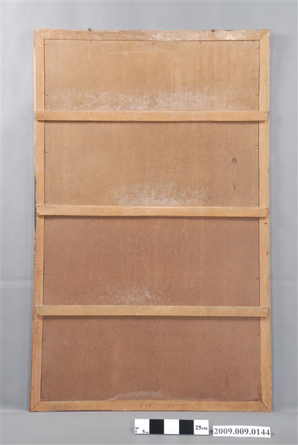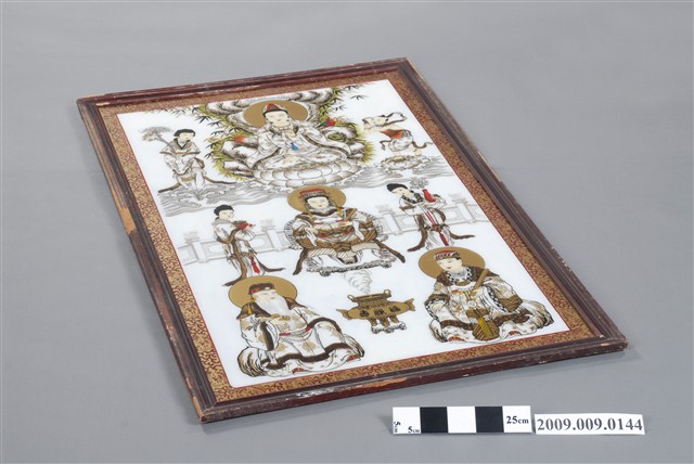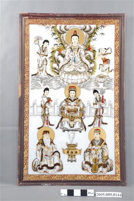本件為玻璃畫神明彩,上層為觀音,左右為善財和龍女,中層為媽祖和一對宮娥,下層為灶君和福德正神,兩神中間有福祿壽薰爐供養諸神。整體裱框略有磨損。此為四尊神明之三段式構圖,是臺灣漢人神明廳常見的神明圖像,構成守護家宅的家神體系。玻璃畫是將畫稿人之底稿置於玻璃下,畫師在玻璃上描好圖案後,在玻璃後進行反畫。