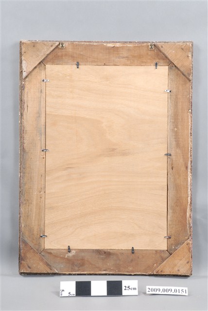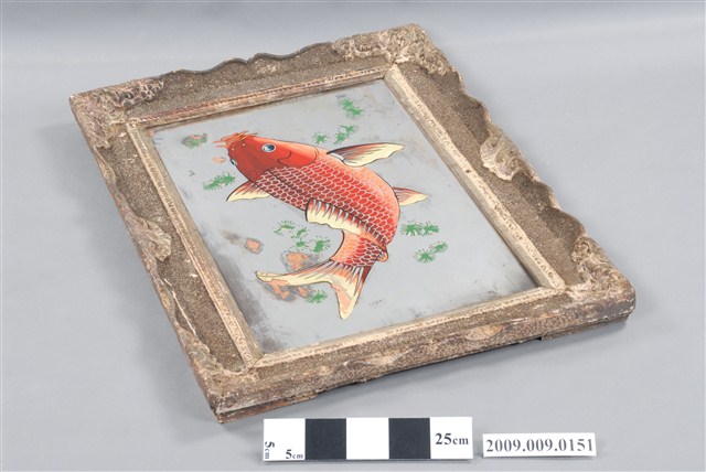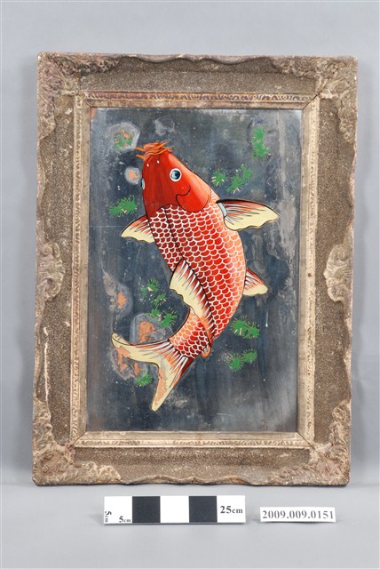1.本件錦鯉玻璃畫為長方形直幅,裱褐色花邊木框成為畫幅,上方釘有二個掛勾,可掛於牆上做為裝飾。畫作主題為一尾紅白色錦鯉,錦鯉身上的鱗片、魚鰭紋路以及鬍鬚都描繪得相當細膩,背景點綴些許綠藻,頗有魚兒優游於水中的意象,鯉魚圖案帶有年年有餘的吉祥喻意。畫面左半部有些許落漆破損痕跡。2.玻璃畫又稱為玻璃彩繪,屬於民間的平面藝術,使用毛筆沾油漆在平板玻璃背面作畫。臺灣的玻璃彩繪約始於日治時期,光復後受到工業化量產的影響開始流行於一般階層,約於民國40、50年代達到鼎盛時期。玻璃畫的題材多帶有吉祥意味,常用來作為祝壽、婚慶、新居落成、商店開張等誌喜之賀禮。