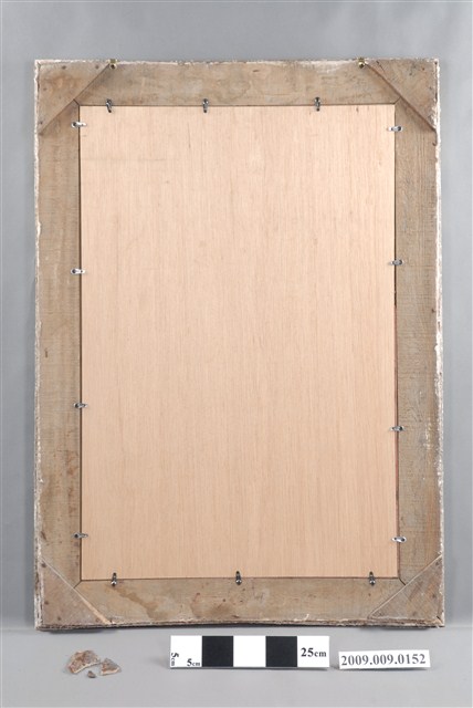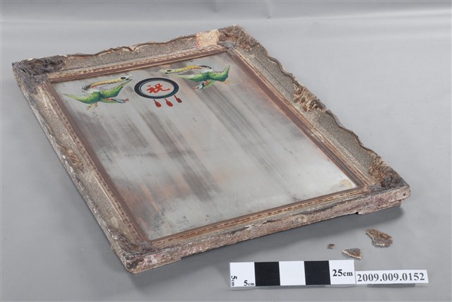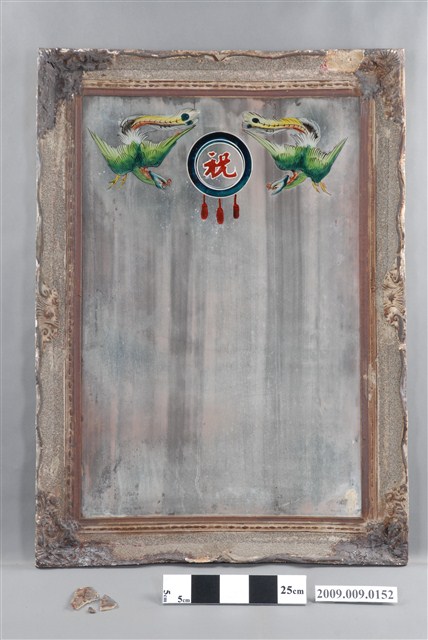本件為臺灣民間玻璃畫,畫面中央上方圓圈內寫「祝」字,外圍由兩隻鳳凰圍繞,鳳凰是百鳥之王,中國傳統常用飛鳳作為圖案,以期帶來祥瑞之意。此玻璃畫作為恭賀送人之禮物。玻璃畫雖有裱框,但有表面有剝落損壞。玻璃畫是將畫稿人之底稿置於玻璃下,畫師在玻璃上描好圖案後,在玻璃後進行反畫。