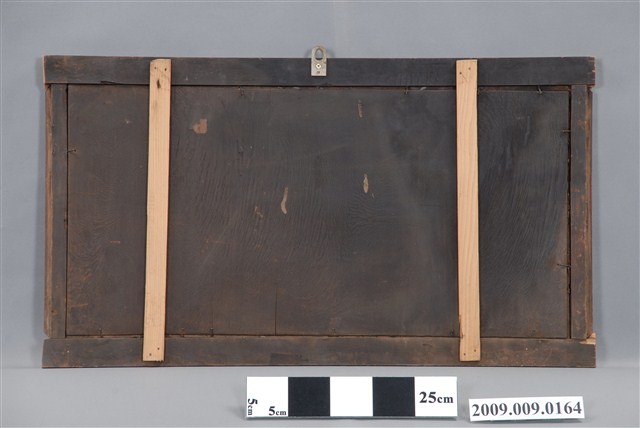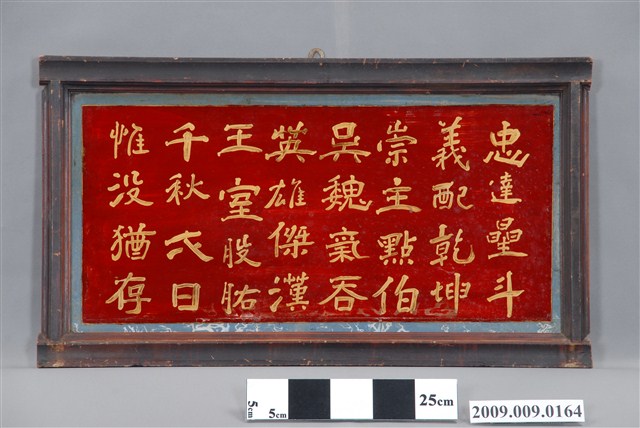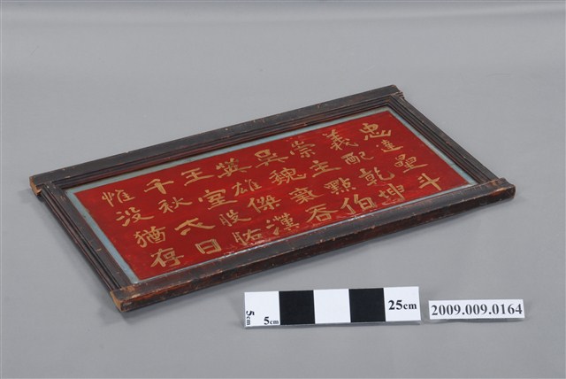 本件為題字玻璃畫,紅色為底,題金字「忠達壘斗義配乾坤崇主點伯吳魏氣吞英雄傑漢王室股□千秋弌日惟沒猶存」,□為「肱」異體字。無彩畫其他圖案。玻璃畫是將畫稿人之底稿置於玻璃下,畫師在玻璃上描好圖案後,在玻璃後進行反畫。