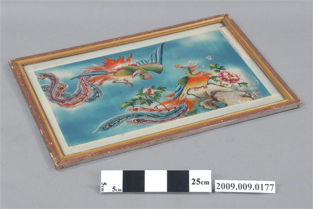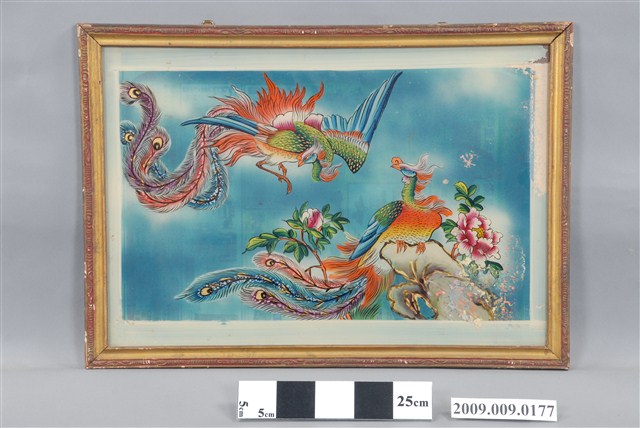 本件為鸞鳳和鳴玻璃畫,用於恭賀新人結婚的賀禮,祝福夫妻感情融洽。玻璃畫錶框。玻璃畫是將畫稿人之底稿置於玻璃下,畫師在玻璃上描好圖案後,在玻璃後進行反畫。
