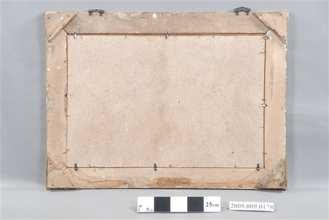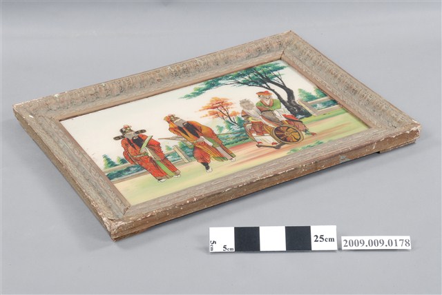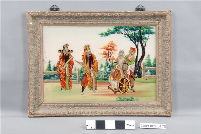 本件為臺灣民間玻璃畫,一位長者乘坐於輦,後有一位僕人伺候,前有一位著文袍之人牽拉著輦,更前方有一位文官回頭注視,比喻榮華富貴之意。玻璃畫錶框。玻璃畫是將畫稿人之底稿置於玻璃下,畫師在玻璃上描好圖案後,在玻璃後進行反畫。
