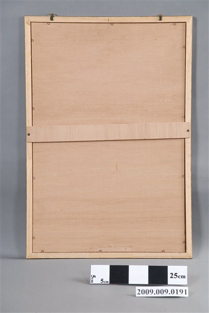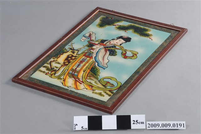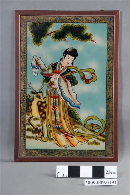 本件為麻姑獻壽玻璃畫,麻姑雙手持托盤,盤中有酒壺、壽桃等物。相傳麻姑是一位長生不老的女神,看起來年輕貌美,實際上年歲已經老到無法計算,因為她曾親眼看見東海三次變為桑田,故後世多以麻姑為長壽的象徵。此玻璃畫多用於祝壽的賀禮。玻璃畫錶框。玻璃畫是將畫稿人之底稿置於玻璃下,畫師在玻璃上描好圖案後,在玻璃後進行反畫。