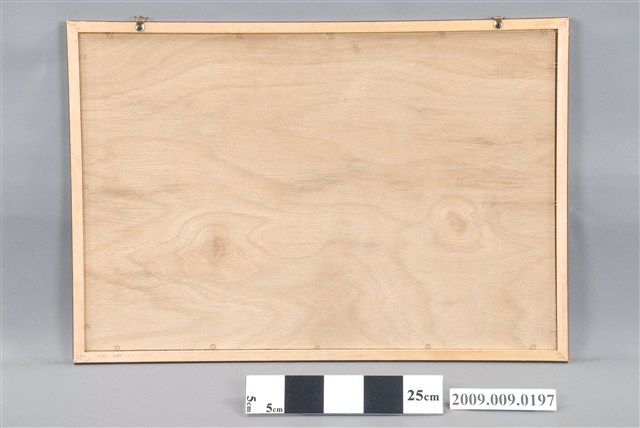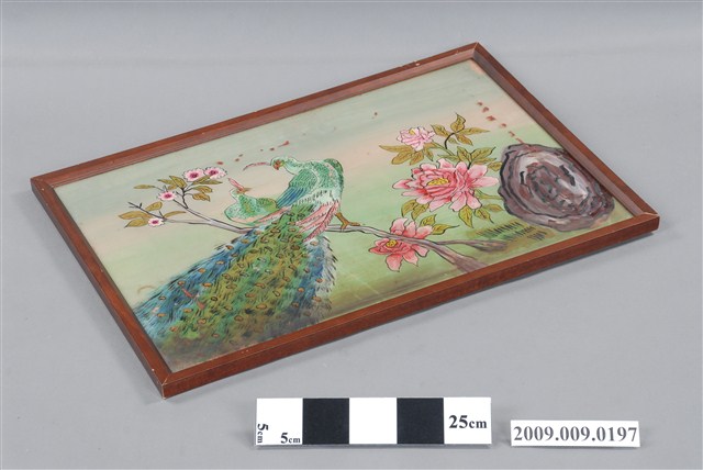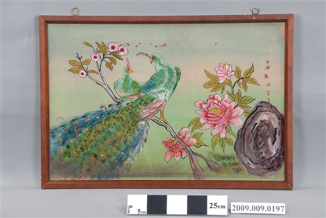 1.本件鳳凰牡丹玻璃畫為長方形橫幅,裱褐色木框成為畫幅,上方釘有二個掛勾,可掛於牆上做為裝飾。畫作主題為一對鳳凰,高踞牡丹花枝頭,左右以盛開的牡丹和花苞陪襯,帶有吉祥富貴的喻意。畫面右側與上方有些許紅色斑點,原本應寫有賀辭,但現已難以辨識。2.玻璃畫又稱為玻璃彩繪,屬於民間的平面藝術,使用毛筆沾油漆在平版玻璃背面作畫。臺灣的玻璃彩繪約始於日治時期,光復後受到工業化量產的影響開始流行於一般階層,約於民國40、50年代達到鼎盛時期。玻璃畫的題材多帶有吉祥意味,常用來作為祝壽、婚慶、新居落成、商店開張等誌喜之賀禮。