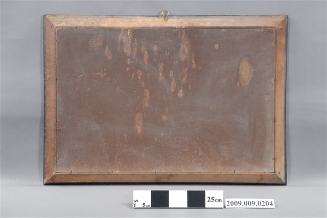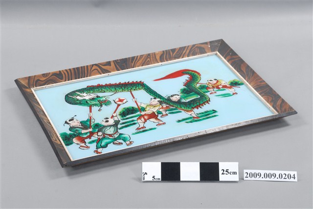 本件為童子舞龍玻璃畫,畫面中五名童子舞龍,表現祥瑞與熱鬧的氛圍。可以作為新居落成和商號開幕誌慶的賀禮。玻璃畫錶框。玻璃畫是將畫稿人之底稿置於玻璃下,畫師在玻璃上描好圖案後,在玻璃後進行反畫。