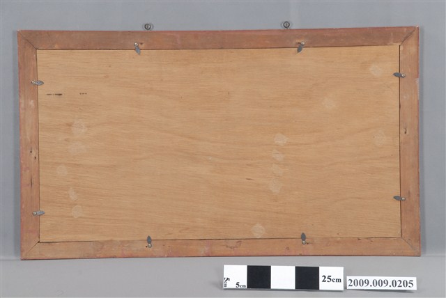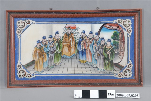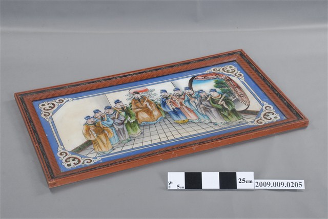 本件為文官上朝玻璃畫,表現太平盛世、國運昌隆的社會狀態。可以作為政治人物的賀禮。玻璃畫錶框。玻璃畫是將畫稿人之底稿置於玻璃下,畫師在玻璃上描好圖案後,在玻璃後進行反畫。