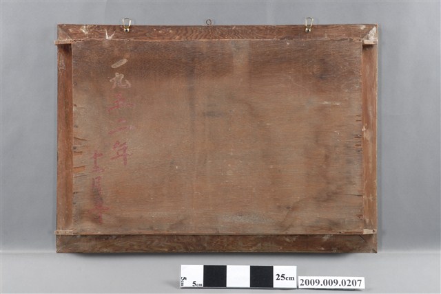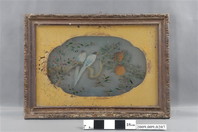 1.本件石榴鳥玻璃畫為長方形橫幅,裱深褐色花邊木框成為畫幅,木框表面略有腐蝕剝落痕跡,木框上方中央有一圓環,左右釘有二個掛勾,可掛於牆上做為裝飾,裱框背面木板以紅筆寫有「一九五二年十二月五日」,標示此畫作繪製日期。畫作採用二層方式營造層次感,上層以橘色框出橢圓形邊框,橘漆有龜裂剝落痕跡,下層描繪兩隻白羽黒頭鳥站立結實纍纍的石榴樹枝上。石榴有多子多孫、早生貴子之意,本件可能為贈予新人的結婚賀禮。2.玻璃畫又稱為玻璃彩繪,屬於民間的平面藝術,使用毛筆沾油漆在平板玻璃背面作畫。臺灣的玻璃彩繪約始於日治時期,光復後受到工業化量產的影響開始流行於一般階層,約於民國40、50年代達到鼎盛時期。玻璃畫的題材多帶有吉祥意味,常用來作為祝壽、婚慶、新居落成、商店開張等誌喜之賀禮。