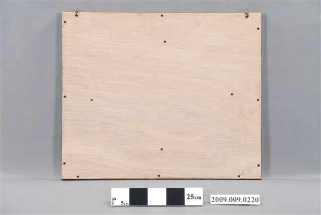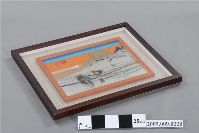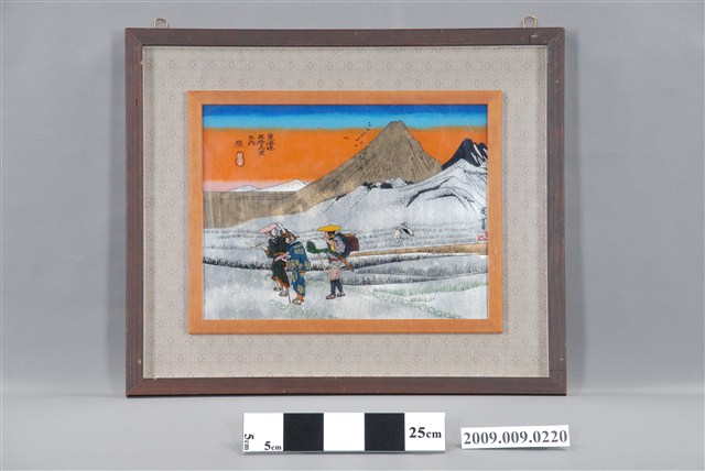 1.本件仿東海道五拾三次原朝之富士玻璃畫為長方形橫幅,裱橘色木框,外加襯布與壓克力材質深褐色木框成為畫幅,木框上方釘有二個掛勾,可掛於牆上做為裝飾。畫作主題仿照日本浮世繪畫師歌川廣重作品東海道五拾三次,描繪三個日本旅人行走於山野田間,左上方有題字:「東海道五拾三次之內 原」與「朝之富士」朱色葫蘆形印,「原」為地名,「朝之富士」為主題名,右下有「廣重画」落款與朱色方印。2.東海道五十三次是日本浮世繪畫師歌川廣重的名作之一,描繪日本舊時由江戶(今東京)至京都所經過的53個宿場景色,及起終點江戶和京都,共55幅畫作。