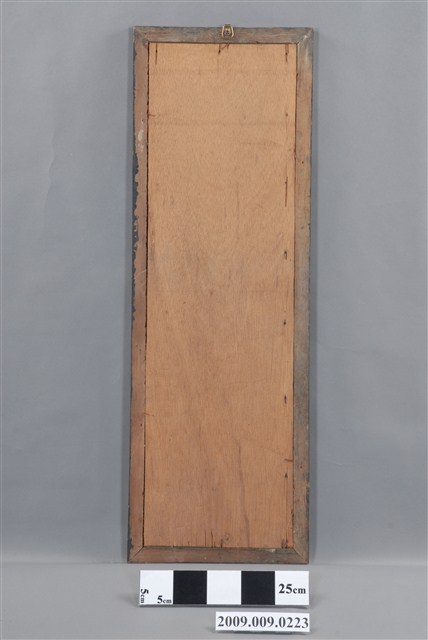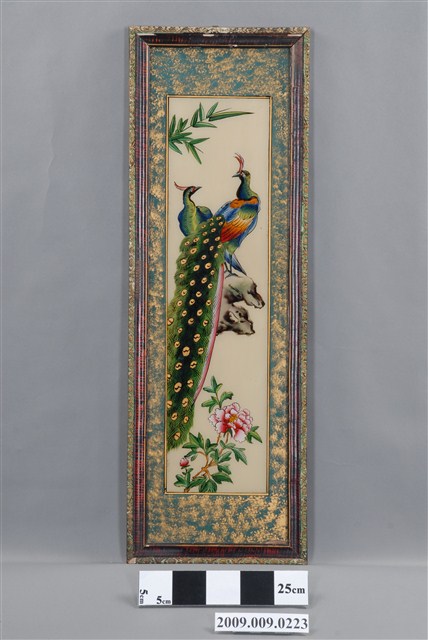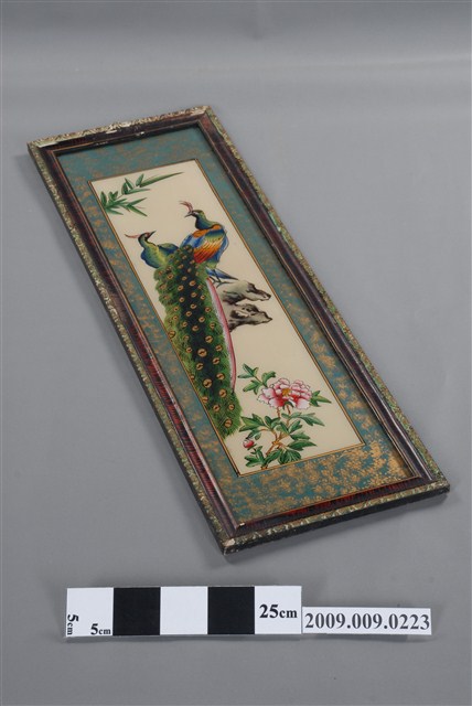 1.本件孔雀牡丹玻璃畫為長直幅,裱深褐色綠花邊木框成為畫幅,木框中央釘有一個掛勾,可掛於牆上做為裝飾。畫面四周以金綠色作一寬邊框,畫作主題為孔雀,描繪一對雌雄孔雀高踞岩石上,下方有盛開的粉紅色牡丹花,帶有花開富貴的吉祥喻意。2.玻璃畫又稱為玻璃彩繪,屬於民間的平面藝術,使用毛筆沾油漆在平版玻璃背面作畫。臺灣的玻璃彩繪約始於日治時期,光復後受到工業化量產的影響開始流行於一般階層,約於民國40、50年代達到鼎盛時期。玻璃畫的題材多帶有吉祥意味,常用來作為祝壽、婚慶、新居落成、商店開張等誌喜之賀禮。