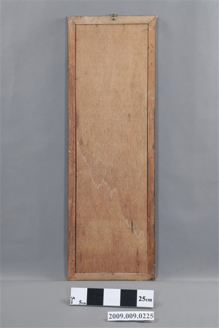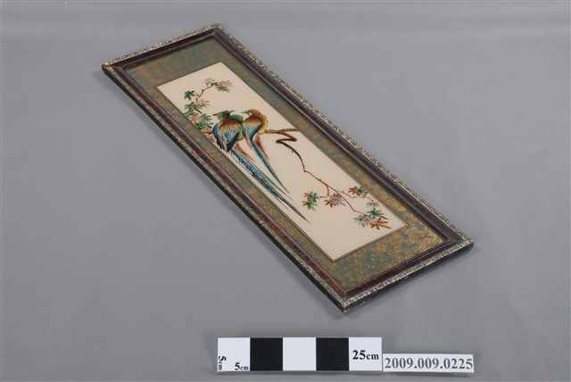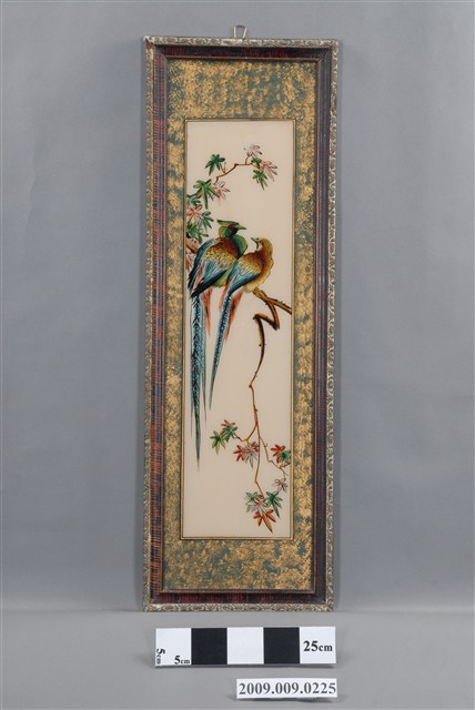 1.本件雙鳥玻璃畫為長直幅,裱紅褐色綠花邊木框成為畫幅,木框中央釘有一個掛勾,可掛於牆上做為裝飾。畫面四周以金綠色作一寬邊框,畫作主題為彩鳥一對,描繪一雄一雌二隻羽毛艷麗的長尾鳥棲息於枝頭上,上下以綠、粉等色花葉陪襯,帶有鶼鰈情深的寓意。2.玻璃畫又稱為玻璃彩繪,屬於民間的平面藝術,使用毛筆沾油漆在平版玻璃背面作畫。臺灣的玻璃彩繪約始於日治時期,光復後受到工業化量產的影響開始流行於一般階層,約於民國40、50年代達到鼎盛時期。玻璃畫的題材多帶有吉祥意味,常用來作為祝壽、婚慶、新居落成、商店開張等誌喜之賀禮。