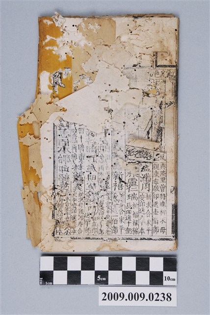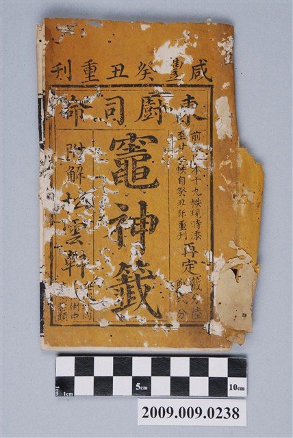 本件是東廚司命灶神籤的籤詩及籤詩解,一般而言,各類的籤詩常見有36首、60首、100首等,會以託名某神明的方式呈現,東廚司命灶神籤是其中一種。書的封面有咸豐癸丑重刊,前□□本十九秩現添至廿七秩自癸丑年重刊再定籤分六解二分。左側書寫附解松雲軒在府城內□□街中□□巷頭。底頁受損嚴重。