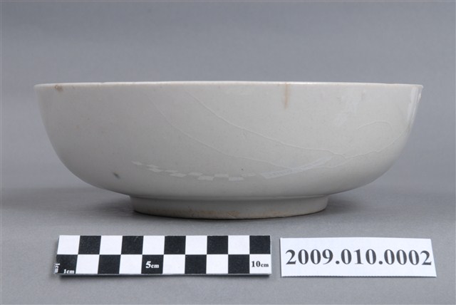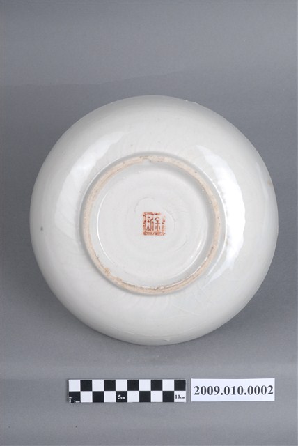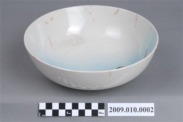 1.本件為噴釉彩繪雙魚紋碗公,器形平沿敞口,淺弧壁,圈足。施釉,碗底有開片現象以及多處咖啡色裂痕,碗底以噴釉輔以彩繪的方式表現兩隻黑白鯨魚悠遊在藍海中的意象,底部有一方形紅色窯廠蓋印。傳統認為餐桌上有魚有蝦,代表生活富足,魚有諧音「年年有餘」的吉祥之意,遂成為常見的碗盤紋飾之一。2.清代至日治時期臺灣碗盤陶瓷器主要由日本及中國大陸進口,直到1930年代後在日政府的鼓勵下,生產碗盤的窯廠在南投、北投、鶯歌、魚池等地陸續出現。從1950-1960年代,碗盤生產集中在北投和鶯歌,1969年北投陶瓷廠關閉,許多窯場逐漸轉移到鶯歌地區。使鶯歌逐漸發展成為臺灣陶瓷重鎮。