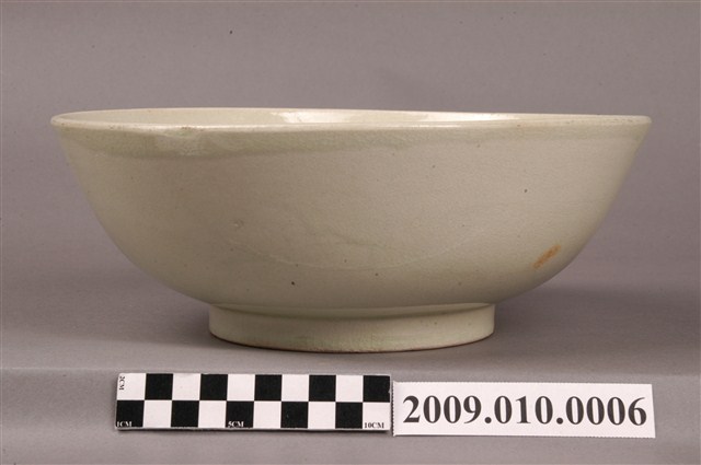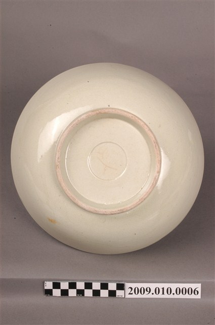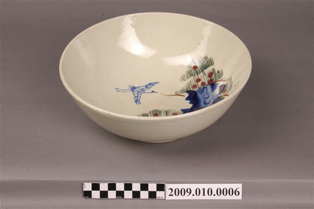 1.本件彩繪松鶴紋碗公,器形呈平沿敞口,深圓腹,有圈足。碗內外壁釉色為米白,有少許顆粒、氣孔,口沿有一小處撞傷缺損。器腹外壁有開片現象。碗內紋飾以彩繪方式表現,碗內底部右方及下方以簡單線條及圓點繪出松樹,左上方蓋印一隻丹頂鶴,表現出正在空中展翅飛翔的意象,整體圖面表現簡單寫意。松樹及鶴皆象徵長壽,因此鶴紋常與松樹紋一同搭配應用在各種工藝品上,取其「松鶴延年」的吉祥寓意。2.清及日治時期臺灣碗盤陶瓷器主要由日本及中國大陸進口,直到1930年代後在日政府的鼓勵下,轉為臺灣自行生產供應內需。1950-1960