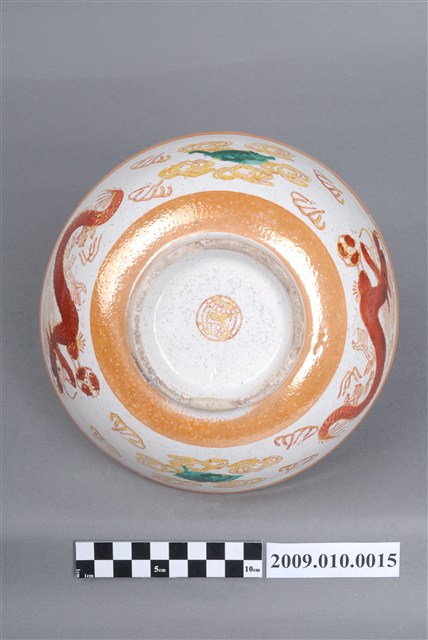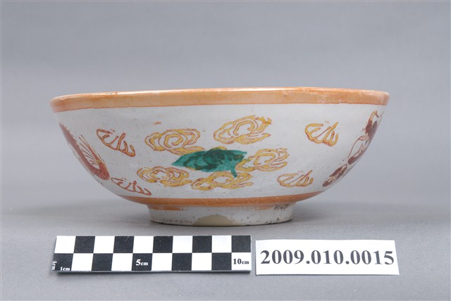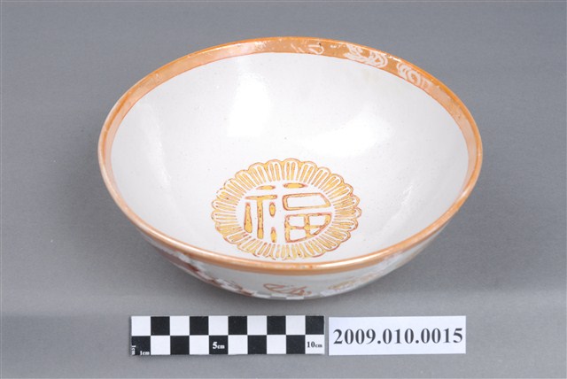 1.本件為印花龍紋福字碗公,器形平沿敞口,深圓腹,厚圈足。碗內外施滿釉,碗外壁呈素白,紋飾主要以印花法搭配彩繪來表現,口沿內外壁以毛筆塗繪一圈黃色閃光釉裝飾,碗內底部印上菊花圖騰,花心處印有一「福」字。碗外壁靠近圈足處亦塗繪一圈黃色閃光釉,碗腹上則圖案印章以閃光釉色蓋印兩隻祥龍輪廓,並用毛筆於龍的身體處填上鐵紅色,在器腹其他部分,蓋上許多雲紋,以表現龍騰雲駕霧之感,圈足中間有鶯歌環球陶瓷公司的地球商標落款。閃光釉為釉上彩的一種,1960年代盛行,以低溫釉上金彩,釉面金光閃閃,但易褪色、保存不易,多在鶯歌地區製作,1980年代後少見。2.清代至日治時期臺灣碗盤陶瓷器主要由日本及中國大陸進口,直到1930年代後在日政府的鼓勵下,生產碗盤的窯廠在南投、北投、鶯歌、魚池等地陸續出現。1950-1960年代,碗盤生產集中在北投和鶯歌,1969年北投陶瓷廠關閉,許多窯場逐漸轉移到鶯歌地區。使鶯歌逐漸發展成為臺灣陶瓷重鎮。