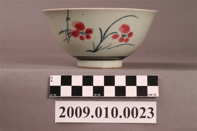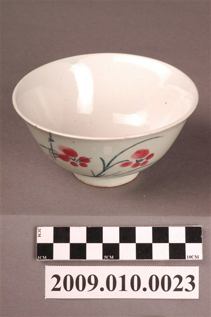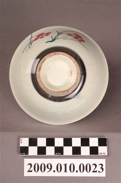 1.本件為彩繪花卉紋碗,器形呈撇口,深腹,小圈足。施釉,碗壁光滑潔白,碗緣有一小處缺損。紋飾彩繪於碗外壁,圈足外側一圈深棕釉色裝飾,器腹上以簡單的綠色線條表現枝葉,粉紅色圓點表現花朵,圖面簡單雅致,臺灣戰後日用碗盤的裝飾以手繪來表現是常見的手法,可看到以植物花卉、花鳥、魚蝦、風景、幾何圖形、文字紋飾等圖案裝飾碗盤。2.清及日治時期臺灣碗盤陶瓷器主要由日本及中國大陸進口,直到1930年代後在日政府的鼓勵下,生產碗盤的窯廠在南投、北投、鶯歌、魚池等地陸續出現。1950-1960年代,碗盤生產集中在北投和鶯歌