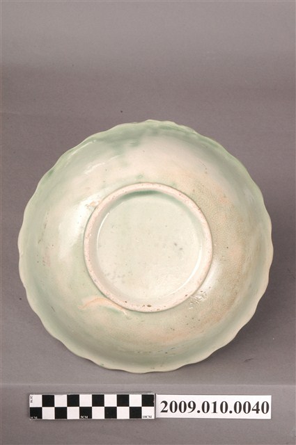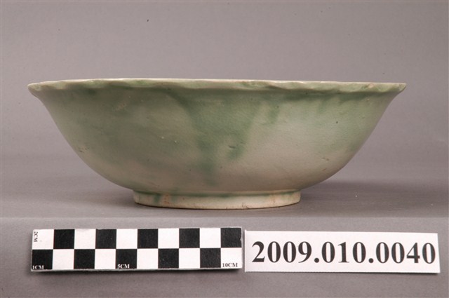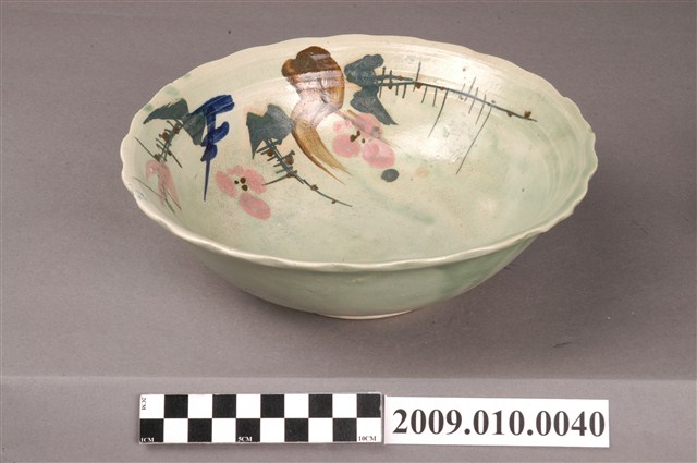 1.本件彩繪松鶴紋碗,器形呈敞開的花口造型,折沿、圓腹,有圈足,碗內器腹上方處有三環凹凸紋路。施淺綠色釉,釉色不均,有顆粒、氣孔及開片現象。碗內紋飾以彩繪方式表現,以簡單線條沿著器壁上繪出折枝花卉,畫風簡逸。臺灣戰後日用碗盤的裝飾以手繪來表現是常見的手法,可看到以植物花卉、花鳥、魚蝦、風景、幾何圖形、文字紋飾等圖案裝飾碗盤。2.清及日治時期臺灣碗盤陶瓷器主要由日本及中國大陸進口,直到1930年代後在日政府的鼓勵下,生產碗盤的窯廠在北、中、南部陸續出現。從1950-1960年代,碗盤生產集中在北投和鶯歌,