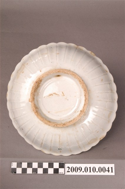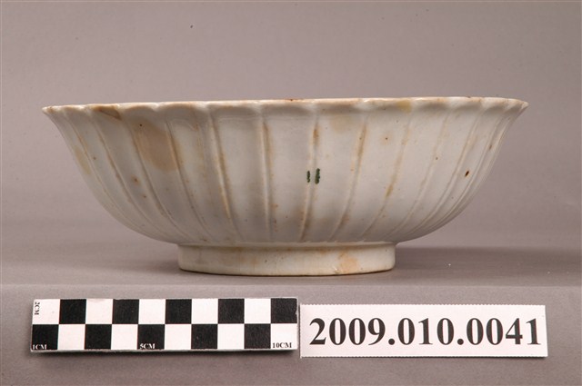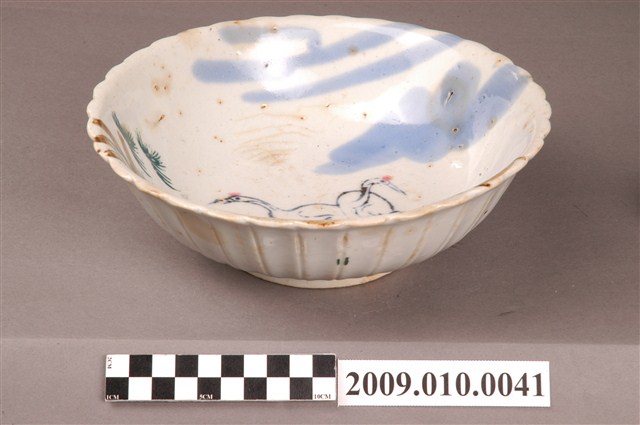 1.本件彩繪松鶴紋碗,器形呈敞開的花口造型,圓腹,有圈足,碗外壁以圈足為中心,有放射狀的花瓣立體紋路。有施釉,碗內外底色為素白,有氣孔、黑點及開片現象,多集中於碗內壁,碗外壁則是有多處淺棕色污漬。碗內紋飾以彩繪方式表現,碗底下方以簡單線條繪出橫置的松樹樹幹,兩旁有綠色松針點綴,並以藍色筆觸表達遠山天空之景,樹幹中央則細細描繪兩隻丹頂鶴停駐其上,兩隻鶴相互依偎,姿態各有不同,畫面十分生動。松樹及鶴皆象徵長壽,因此鶴紋常與松樹紋一同搭配應用在各種工藝品上,取其「松鶴延年」的吉祥寓意。2.清及日治時期臺灣碗盤