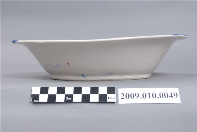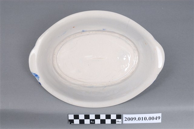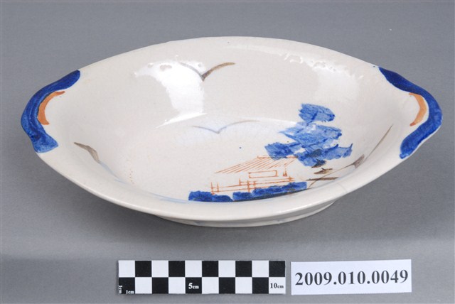 1.這件彩繪海景圖橢圓碗,是北投窯廠產製的日用陶瓷器皿。器形呈橢圓形,圓唇,折沿口、略微歪斜,兩端帶耳,平底,弧腹,圈足。圈足刮釉露胎,胎色乳白,胎質細密。碗底以印花加彩的技法作海景圖裝飾,先以橡皮印章沾紅釉蓋印屋舍、沾墨綠釉印海藻,再以幾筆淡藍色釉作海浪、褐釉繪海岸與鳥群、青花繪樹林、紅釉繪魚群,圖案抽象簡化,筆跡明顯。2.日人進入北投經營窯業,也將日本時常使用的陶畫題材引進臺灣,海景圖即是其中一個例子。這種風景圖案的構圖大多是左側海洋中有出航的船舶,右側岸上有屋舍、樹木,上方繪遠山及鳥群,不過依裝飾技法與繪彩筆跡稍有細微差異。海景圖從日治時代起便被使用在日用器皿上,直到戰後仍被延續使用。