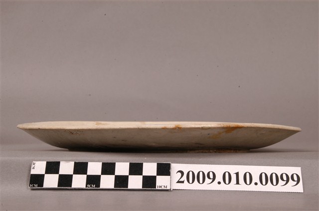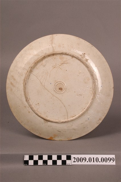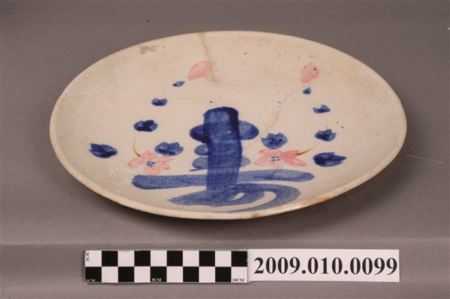 手繪青花壽字紋圓盤圓唇,侈口,口沿不平整,淺腹下斂至圈足,圈足內壓印雙圈紋,圈足露胎。胎體白中略帶黃,全器施白釉,微泛米黃光澤。盤心與盤外壁可見多處釉體龜裂痕跡以及部分開片,盤外壁則有流釉現象;器表皆有經久使用的痕跡與顏色沈澱。盤正中行以鈷藍釉書書寫一大「壽」字,兩旁點綴藍釉、粉紅釉花瓣紋樣。以字體裝飾瓷器常見於中國傳統器皿之中,臺灣早期製瓷偏好使用帶有吉祥寓意的字彙,如壽、吉、福等,有祝賀之用意。文字紋樣的器皿眾多,書寫、妝點方式相似,可見臺灣瓷器的商業性與通俗性。