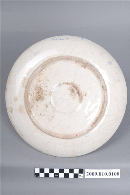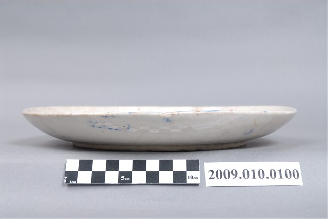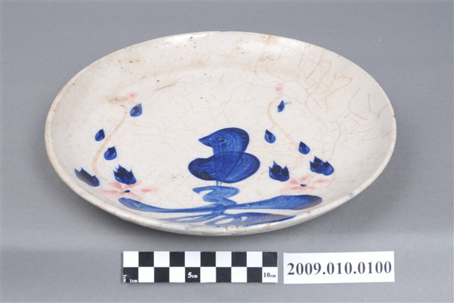 手繪青花壽字紋圓盤圓唇,侈口,口沿不平整,淺腹下斂至圈足,圈足內壓印圈紋,圈足露胎。胎體白中略帶黃,全器施白釉,微泛米黃光澤。盤心與盤外壁可見多處釉體龜裂痕跡以及部分開片,盤外壁則有流釉現象以及多處釉料沾染;器表皆有經久使用的痕跡與顏色沈澱。盤正中行以鈷藍釉書書寫一大「壽」字,青花發色濃重但不均,兩旁點綴藍釉、粉紅釉花瓣紋樣。以字體裝飾瓷器常見於中國傳統器皿之中,臺灣早期製瓷偏好使用帶有吉祥寓意的字彙,如壽、吉、福等,有祝賀之用意。文字紋樣的器皿眾多,書寫、妝點方式相似,可見臺灣瓷器的商業性與通俗性。