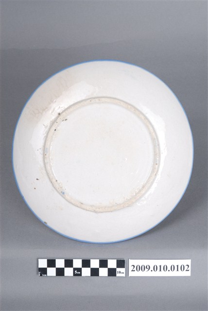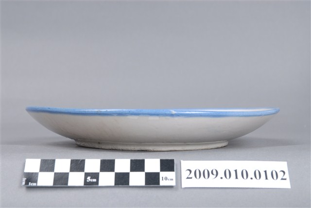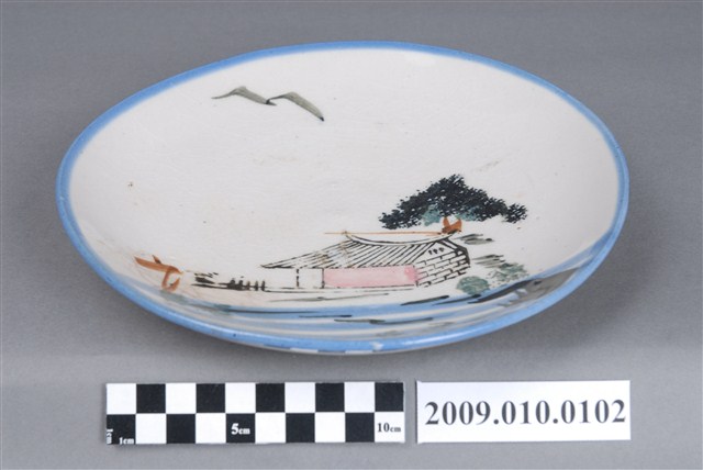 手繪池塘人家圖圓盤圓唇,口沿微微外敞,淺圓腹,斜壁下斂至圈足,矮圈足,圈足內壓印雙圈紋,平底露胎。胎體白淨,通器白釉瑩潤,盤底略有氣孔與縮釉現象。口沿處施罩一圈鈷藍釉彩,發色均勻,盤中央以一磚造房屋為主體,描繪位於前方的水塘與後方樹木。紋樣中的建築物可見臺灣傳統建築的特色:鴟尾、紅磚造的低矮建築物。房屋線描精緻,以黛綠描繪樹木與池塘上方漂浮的葉子,使整體畫面較為穩重。早期房屋前方有池塘,後面有院子,十足的臺灣民間日常寫照,反映了臺灣瓷器選取的題材多以貼近民眾生活為主。