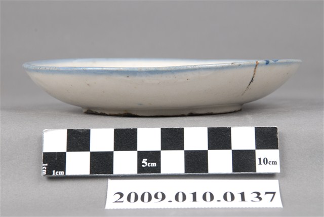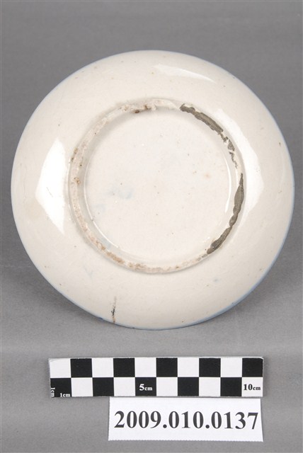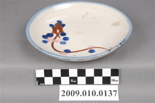 手繪青花花卉紋圓盤仰鏇壓法製作,圓唇,口沿略不平整,圓腹,平底,低圈足,圈足露胎。全器施以白色化粧土後,以釉下彩繪裝飾,器緣畫上淺藍色邊線。器面內緣壓印一弦紋,主要紋飾彩繪花卉,以褐色畫出主枝與底部的井字形枝條,中間各畫圓點狀的粉紅色與藍色花卉,整體紋飾雖不寫實,但手法稚拙可愛。全器施以透明釉後入窯燒製,釉面有許多碎細的開片,並有少許針孔與斑點,且口沿處有一龜裂痕跡,應是長久使用後所產生的。