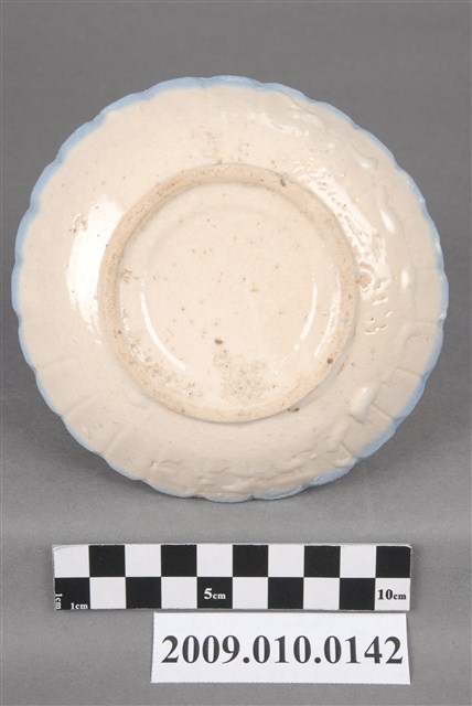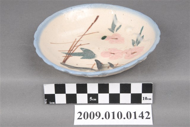 手繪粉紅釉花卉紋花口盤為高溫燒製且由模具成形,圓唇,口沿外侈且不平整,波浪狀口沿作花口狀,淺圓腹,弧壁下收至圈足,圈足徑適中,約等同於口徑一半的大小,圈足露胎,胎色白中略帶黃,胎質較粗,胚體較厚。全器滿施白釉,釉面呈色略帶暖色調,器表有多處積釉。外壁素面無紋,以模印的方式做出長條狀,呼應口沿的波浪形狀。紋飾集中於盤面:折沿口緣處施罩一圈鈷藍釉裝飾,青花發色略微偏淡。主要紋飾繪於盤心一側,以粉紅釉、綠釉為主要色調,描繪盛放的花草,並以褐釉與更深的綠釉點綴,繪成支架與草葉,頗有花園一角的樣貌,增添整體紋飾的色