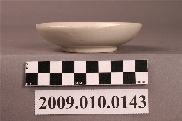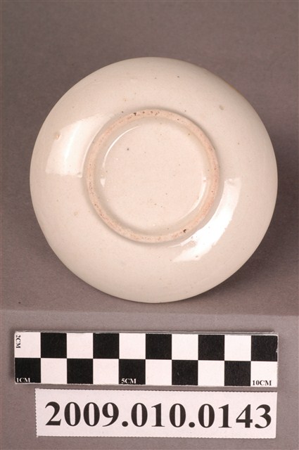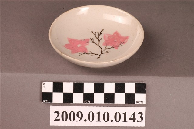 1.印彩繪粉紅釉花卉紋圓盤為高溫燒製,圓唇,侈口,口沿略不平整,圓鼓腹,弧壁下收至圈足,平底露胎,胎色白中帶黃。全器施白釉,呈色淨白潤澤並略泛黃,釉面光滑,但器壁、圈足周圍有許多氣孔,口沿有幾處破損以及使用的磨損痕跡。盤外壁素面無紋,主要紋飾為繪於盤內的兩朵連枝、盛開的大朵花卉,以粉紅釉描繪花瓣,重複疊加釉色,以致花瓣的釉色深淺層次分明,視覺上產生花瓣繁密的效果。另以褐色釉繪細長的枝幹,增添構圖層次,整體畫面左右對稱、十分簡潔。2.素面圓盤是民間用器中常見的盛裝器皿的器形,多以粉紅釉、鈷藍釉、黛綠釉等釉