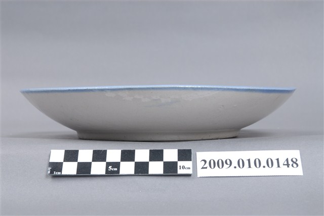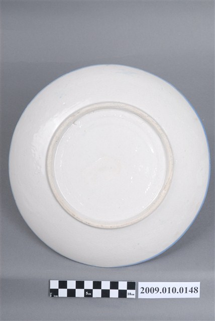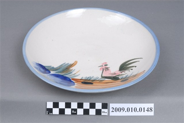 1.手繪彩釉雞紋圓盤圓唇,侈口,口沿歪斜,淺圓腹,弧腹下斂至圈足,圈足刮釉露胎,胎色較白,胎質細。碟底可見鑄造技法所留的鏇胚痕跡。口沿以鈷藍釉施罩一圈裝飾帶,碟心以黑彩與胭脂紅釉繪一立於土面的公雞,公雞形象以減筆式的寫意畫法描繪,昂首挺立,十分精神。周圍以彩釉繪碎石雜草,筆法簡潔規律,使整體畫面更為完整,筆法更添古樸意味。2.臺灣早期社會常以雞作為吉祥紋飾,因雞又諧音閩南語的「家」,能夠象徵起家、興家等家丁興旺的寓意,是日常器皿中常見的紋飾之一。